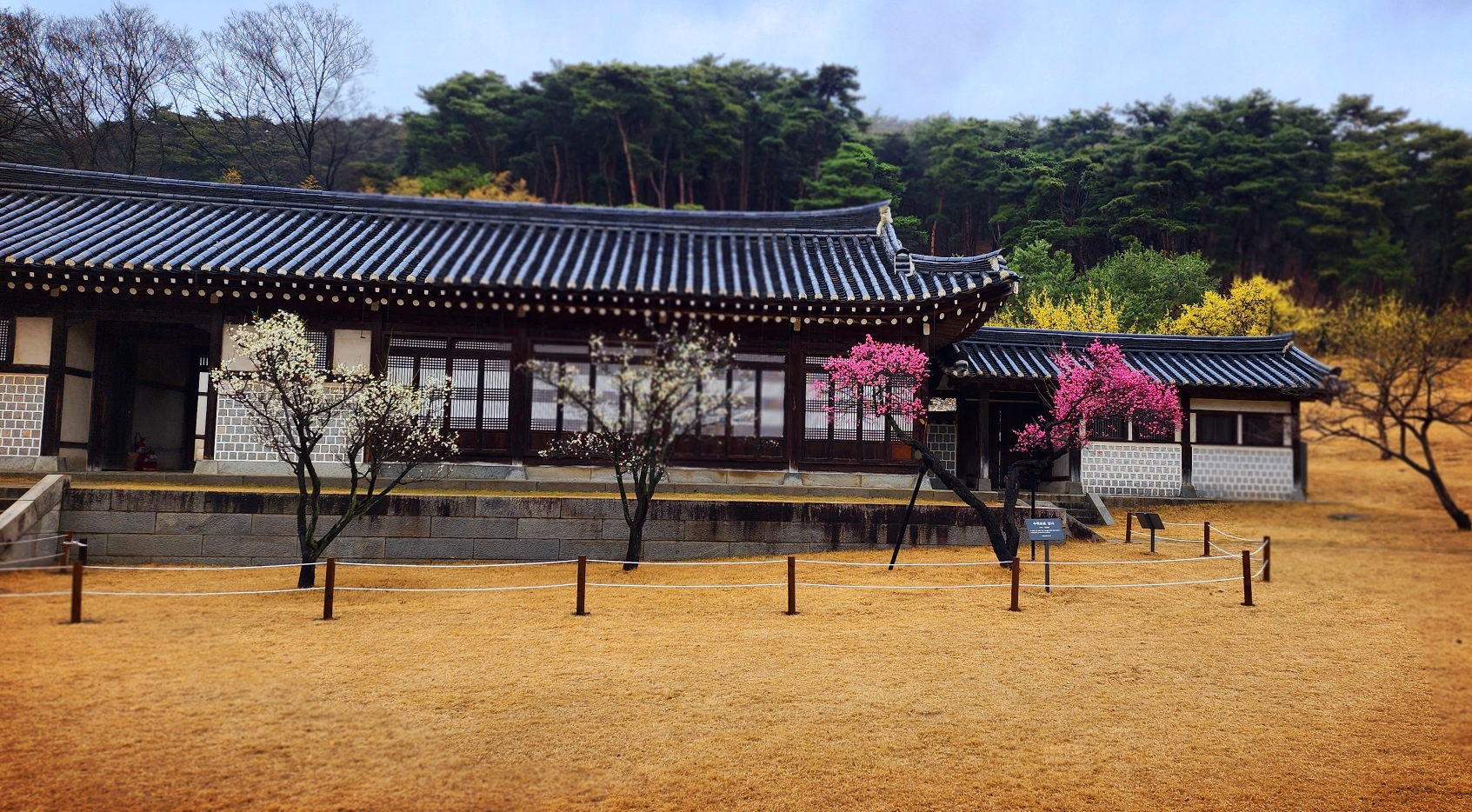 특히나 비가와 고택의 어두운 기와색과 찐한 나무기둥을 배형으로한 붉디붉은 홍매화가 너무 화사하고 멋스럽다.